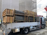 型枠材リース業者様からのご依頼により、7tユニックセルフ車(荷台長さ520cm×荷台幅230cm×最大積載量7,000kg)にて型枠材を岡山市北区東古松から岡山市北区上土田まで運搬させていただきました。