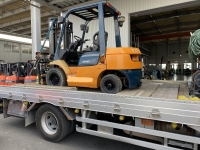 フォークリフトリース業者様からのご依頼により、7tユニックセルフ車(荷台長さ509cm×荷台幅222cm×最大積載量7,400kg)にてフォークリフトをチャーター常用便(半日)で運搬させていただきました。