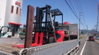 フォークリフトリース業者様からのご依頼により、7tユニックセルフ車(荷台長さ523cm×荷台幅230cm×最大積載量6,900kg)にてフォークリフトを瀬戸内市長船町土師から赤磐市まで運搬させていただきました。