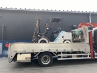 フォークリフトリース業者様からのご依頼により、7tユニックセルフ車(荷台長さ430cm×荷台幅221cm×最大積載量7,100kg)にてフォークリフトを倉敷市東塚から倉敷市真備町まで運搬させていただきました。