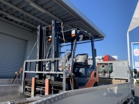 フォークリフトリース業者様からのご依頼により、7tユニックセルフ車(荷台長さ520cm×荷台幅230cm×最大積載量7,000kg)にてフォークリフトをチャーター常用便(1日)で運搬させていただきました。