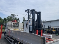 フォークリフトリース業者様からのご依頼により、7tユニックセルフ車(荷台長さ520cm×荷台幅230cm×最大積載量7,000kg)にてフォークリフトを岡山市中区新築港から都窪郡早島町早島まで運搬させていただきました。